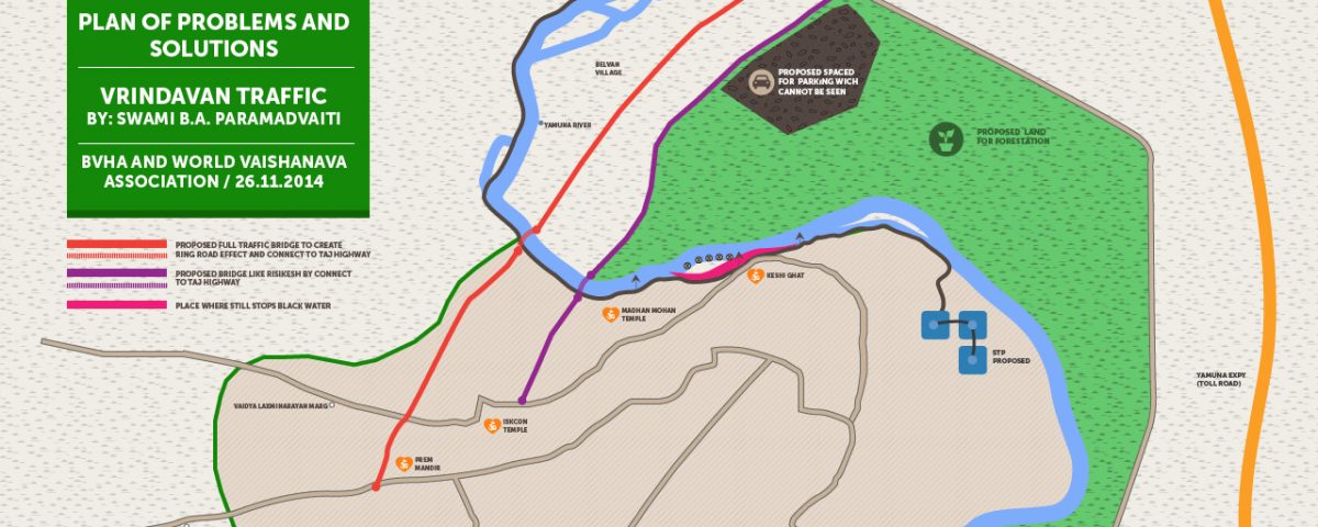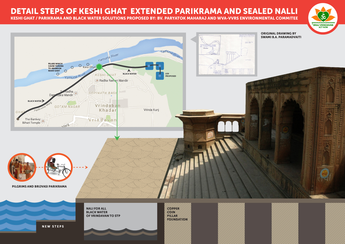 February 25, 2015This special proposal gives an idea of how the polluted/black water of Vrindavan could be canalized along the ghats without touching the waters of the Yamuna and diverted to the Kumbha mela grounds. At these grounds the water could be processed through various purifications systems and techniques enabling larger parts of dirt to be removed. This water could also be put through some natural filter systems so that this purified water could be let back into the Yamuna.Unfortunately at this point, the tank systems in place at the Kumbha mela grounds will not be effective in the monsoon unless very high walls are build and they are converted into sophisticated tanks of STP (water purification) quality.